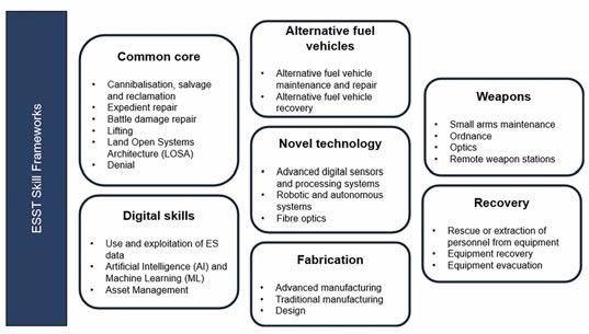 The output of the TNA was the identification of capability gaps within what was articulated as Skills Frameworks as shown in the attached diagram. These frameworks summarise and highlights the key areas identified by the ESST TNA as gaps in existing ES training. The next steps of ESST will look to design new training delivery mechanisms to close these gaps and deliver enhanced skills through multiple training mechanisms across Units, DSEME, REME Arms School and other training delivery establishments.