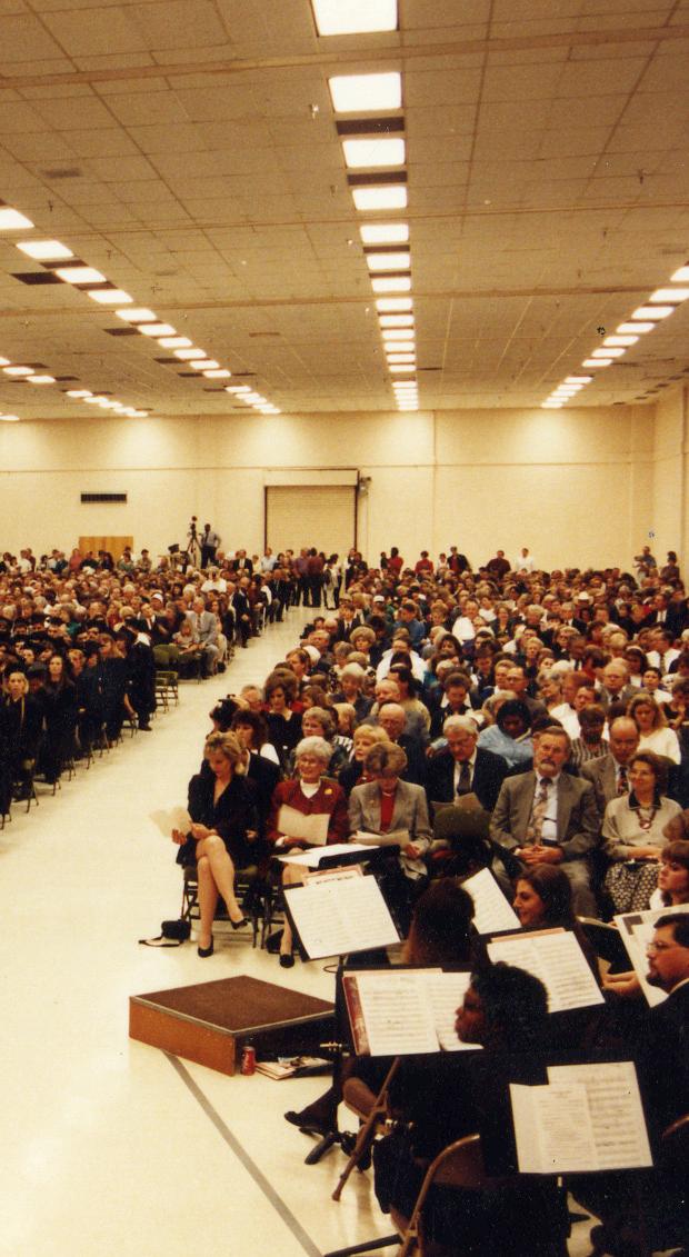 Early 1990s commencement in Harvey Convention Center, where the ceremonies took place before the Cowan Center was built.