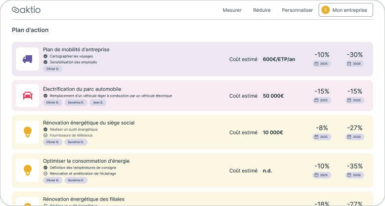 Grâce à sa plateforme conforme à la méthode Bilan Carbone® et compatible avec l’ensemble des standards méthodologiques en vigueur (GHG Protocol, ISO 14064, SBTi), Aktio vous accompagne pour :