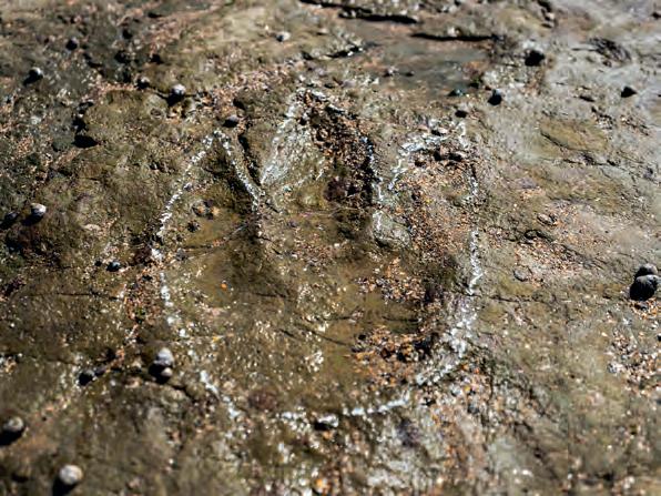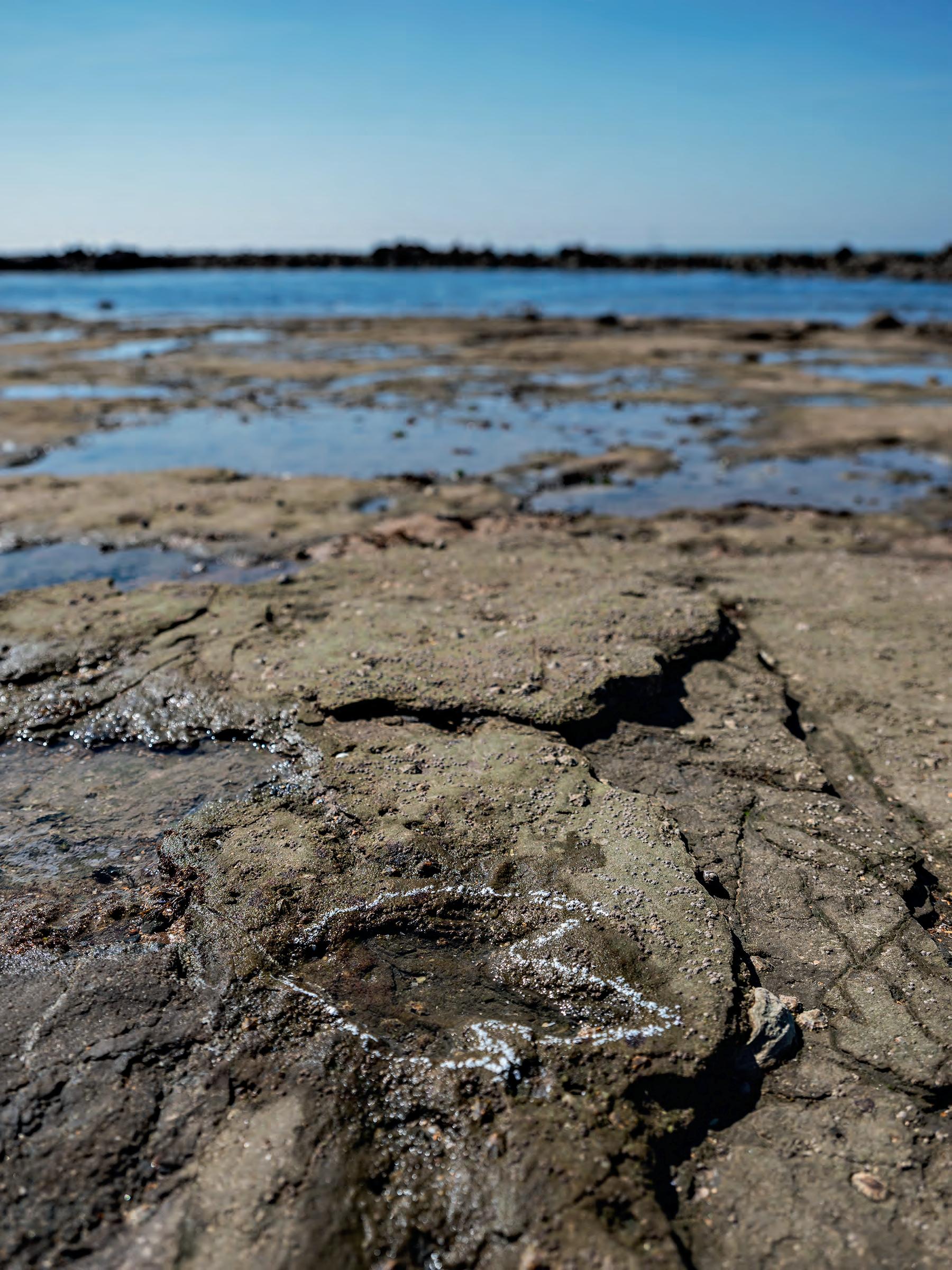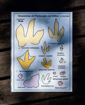 « Faire connaître, aimer et respecter. » Trois verbes comme un mantra, que M. Guichard justifie aisément : « pour aimer, il faut connaître, et il est plus facile de respecter quand on aime. » Une logique qu'il applique à tout sujet, d'autant plus lorsqu'il s'agit des empreintes de dinosaures fossilisées dans la roche de l'anse de la République. Une zone longue de 800 mètres qu'il connaît comme son jardin. Très vite, il pointe une forme, puis une autre, et une troisième, avant d'en matérialiser précisément les contours à la craie blanche : « elles sont vraiment caractéristiques, on voit bien les trois doigts, l'enchainement pied droit, pied gauche... c'était un bipède. » Il parcourt la distance entre deux traces : « je dois faire deux pas là où lui n'en a fait qu'un. Cela nous donne une information sur sa taille, presque le double de la mienne. C'était un animal d'au moins trois mètres de haut ! » Un peu plus loin, d'autres traces, plus petites. Celles d'une autre espèce, « qui devait faire la taille d'une oie » Dans les années soixante-dix, des chercheurs ont étudié ces empreintes et ont pu déterminer que ces traces sont celles d'eubrontes et de grallators. Ces dinosaures vivaient là, sous un climat tropical, il y a 200 millions d'années. C'était avant la dérive des continents, et donc avant même l'apparition de l'océan Atlantique. À titre de comparaison, l'homo sapiens a vu le jour il y a « seulement » 300 000 ans.