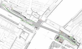 L’atterrissage de la passerelle nécessite un réaménagement complet du petit parking avec la suppression de places de stationnement, la réalisation de rampes aux normes PMR (personne à mobilité réduite) avec un revêtement pavés granit. L’aménagement est complété par la création d’aménagements paysagers dont une zone végétalisée à proximité du Canal avec des plantations et du mobilier urbain (bancs, tables de piquenique et supports vélos). Les platanes existants sont conservés.