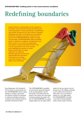 Redefining boundaries Vryhof Anchors, world leaders in the market for innovative and customer-focused anchoring and mooring solutions, will be launching a revolutionary new anchor during the OTC 2017 event in Houston. Following two years of development and testing, the Dutch company is proud to announce the launch of its STEVSHARK®REX. Better, smarter and stronger, STEVSHARK®REX delivers holding power in extreme conditions unmatched by any other anchor. As a result, the application boundaries of drag-embedded anchors can now be expanded to the most remote and challenging territories on earth. Super-strong soils no longer represent an obstacle, thereby opening up economic opportunities for operators to develop new energy resources across a much larger area worldwide.