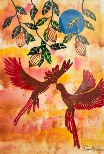 Côca brinca com a mistura das cores, percorrendo novos possíveis, com tons terrosos misturados ao azul forte e em tonalidades variadas, ao preto, ao ocre e ao marrom, com vermelhos intensos e brancos marcantes. A vegetação situa seus pássaros numa realidade primitiva, como a querer, no dizer de André Bloc resgatar a “arte escondida de um povo esquecido”; resgatar e dar uma nova roupagem, complemento.