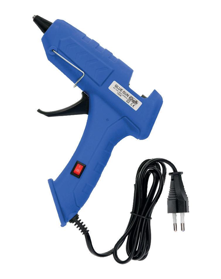 Pistola de pegamento termofusible. Con gatillo dispensador. Ideal para realizar trabajos manuales. Potencia: 100 W. Incluye 2 barras sólidas de 100 mm de largo x 11 mm de diámetro. Medidas: 165 x 160 x 37 mm.