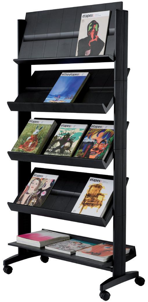 Fácil de desplazar gracias a sus cuatro ruedas. De estructura metálica con refuerzos de metal y acabado de plástico negro. 5 repisas de alto impacto. Visión total de los documentos. Borde de 3,5 cm. Color negro. Medidas: 85,5 x 167,5 x 38,5 cm. Peso: 15 kg. El expositor.