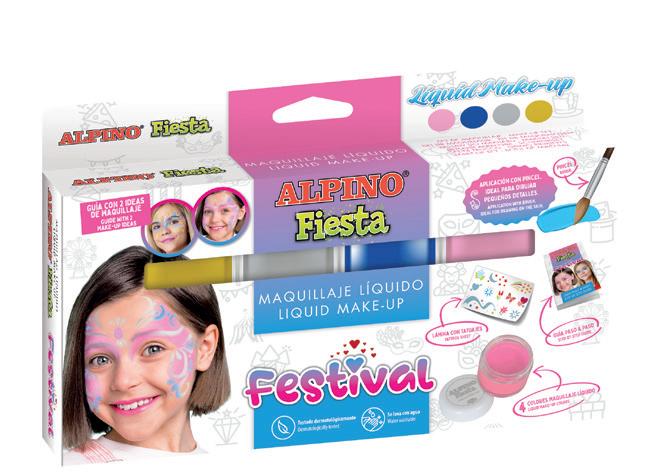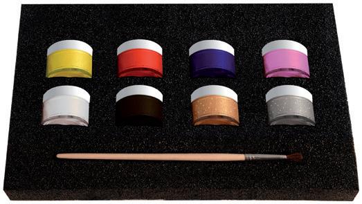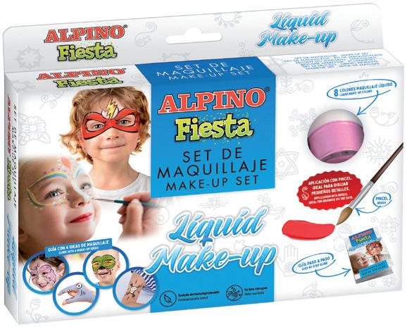 Maquillaje líquido, tipo tattoo. De fácil aplicación con pincel. Permite dibujar pequeños detalles o maquillar grandes zonas. Una vez aplicado no mancha. Los colores se pueden mezclar. Contiene: 8 colores, pincel y folleto con ideas. Frascos de 10 g. La caja de 8 frascos.
