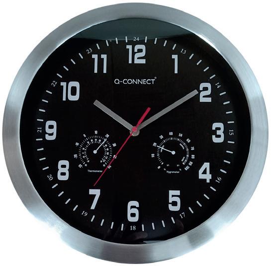 Reloj de pared, diseño moderno y actual. Marco metálico de color cromado. Con números blancos sobre un fondo de color negro. Números grandes para una lectura fácil. Termómetro e higrómetro incluido para indicar la temperatura y la humedad en el aire. Mecanismo silencioso. Funciona con 1 pila AA (no incluida).