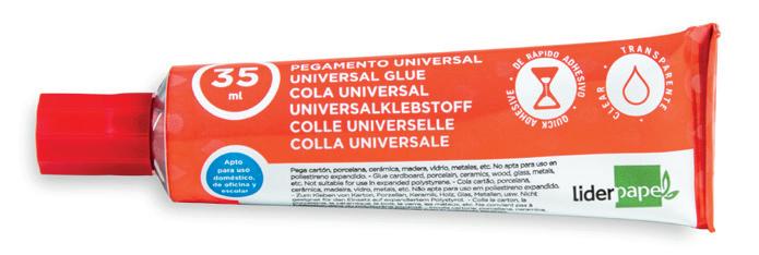 Especialmente indicado para reparaciones del hogar. Resistente al agua, transparente y de rápido secado. Con un acabado limpio y que no arruga el papel, permite corregir durante un breve espacio de tiempo. Indicado para pegar porcelana, cerámica, madera, vidrio, metal, cuero, corcho y la mayoría de los materiales sintéticos. Apto para uso escolar. El tubo.