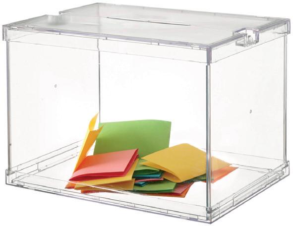 Urna electoral oficial plegable. Fabricada en metacrilato transparente de gran calidad y resistencia. Espesor de 3 mm (estructura) y 4 mm (base y tapa). Con ranura de 180 x 8 mm. Incluye 2 precintos de seguridad. Se suministra sin montar. Color cristal transparente y base blanca. Fabricado en España. Medidas exteriores: 310 x 440 x 315 mm. La urna.
