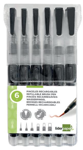 Pinceles con depósito de agua idóneos para colorear y acuarelar, el depósito se puede llenar de agua para mezclar la pintura y conseguir auténticos efectos de acuarela, cuerpo fácil de apretar y sistema de válvula que permite controlar el flujo del agua, Juego de 6 pinceles con puntas de distinto grosor. El blíster de 6 pinceles.