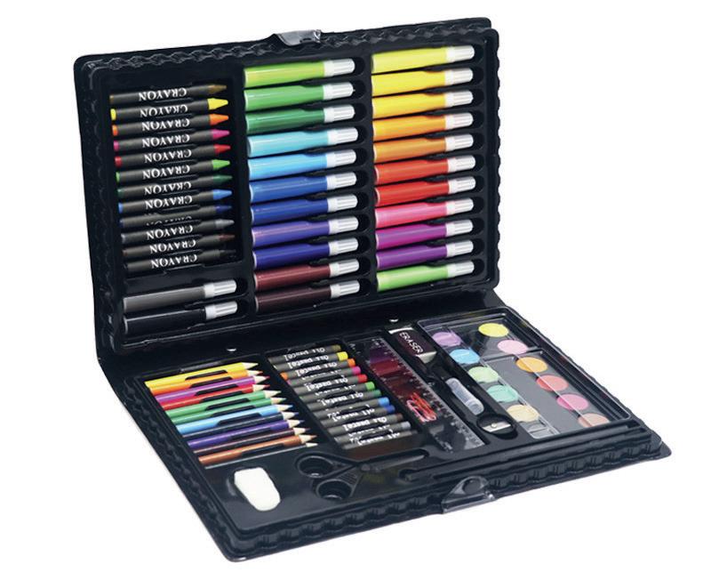 Conjunto de dibujo y coloración: elementos esenciales creativos para dibujar, colorear y hacer en cualquier momento y en cualquier lugar. Contenido: rotuladores de colores, lápices de colores, ceras de colores, colores de acuarelas, ceras blandas de colores, clips, lápiz, pincel, pegamento, goma, sacapuntas, tijera, regla, paleta y esponja. 86 piezas. Medidas: 34 x 23 x 3,2 cm. El set.