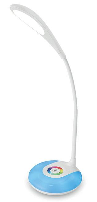 Lámpara de mesa o escritorio inalámbrica con batería recargable fabricada en ABS. Esta lámpara está especialmente diseñada para iluminar sin dañar la visión de los niños. Los leds de colores permiten crear diferentes ambientes, cada color se adapta a una situación: descansar, leer o estudiar. El brazo es inclinable para ajustar la difusión de la luz. Interruptor táctil. Con 3 niveles de brillo. Ahorro de energía. Potencia: 5W. Cable para cargar incluido. Color blanco. Medidas: 133 x 209 x 137 mm. La lámpara.