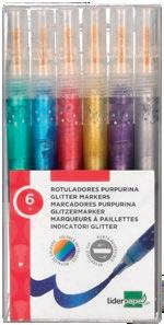 Caja de 6 rotuladores glitter efecto purpurina metalizado, con punta redonda y biselada. Ideal para colorear y marcar, decorar carteles, álbumes de fotos, etiquetas de regalo, tarjetas de felicitación, diarios o scrapbooking. Colores intensos con reflejos brillantes y múltiples proyectos creativos, diversión creativa de pintura, dibujo y manualidades. Colores surtidos. La caja de 6 rotuladores.