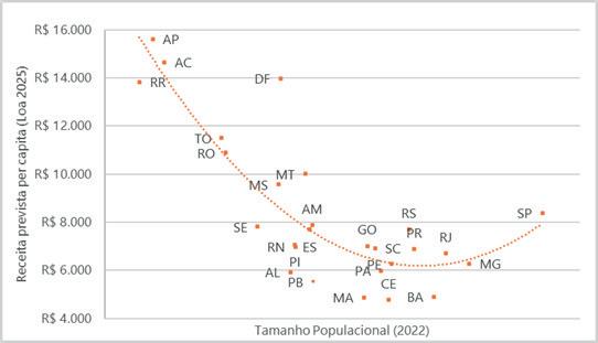 No grupo I, os estados com população inferior a 2 milhões de habitantes possuem um orçamento médio R$ 12 milhões e uma receita estimada per capita de R$ 11.460 em 2025. Já os estados do Grupo II, possuem uma população entre 2 e 5 milhões de habitantes, orçamento médio de R$ 25 milhões, e uma receita estimada per capita de R$ 7.720 em 2025, sendo o Distrito Federal um outlier. No Grupo III, a população varia entre 6 e 20 milhões de habitantes, com orçamento médio de R$ 62 milhões e uma receita estimada per capita de R$ 5.647 em 2025. Por fim, o Estado de São Paulo e sua escala singular, com população de 44 milhões de habitantes e orçamento de R$ 372 milhões, e uma receita estimada per capita de R$ 8.386 em 2025. As informações sobre o orçamento pelo lado da receita em termos per capita e o tamanho populacional formam a curva de escala orçamentária (figura 3), em formato de U não linear. Esse formato significa que os orçamentos dos extremos são maiores em comparação aos orçamentos do centro da distribuição.
