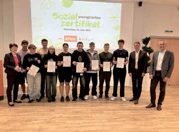 Im Rahmen des Sozialzertifikats der youngCaritas Tirol werden Lehrlinge, Auszubildende und Trainees in drei Modulen in wichtigen sozialen Kompetenzen geschult. Insgesamt zehn Lehrlinge von Kufgem und dem Gartengeräte-Hersteller STIHL Tirol haben in den vergangenen drei Jahren alle Module mit großem Engagement absolviert und wurden im Juni 2024 mit dem Sozialzertifikat ausgezeichnet.