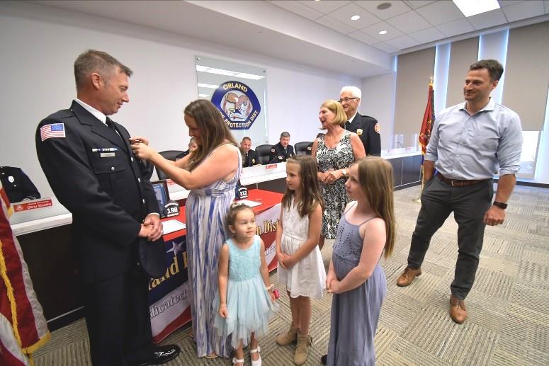 Next Commissioner Kraemer administered the Lieutenant Oath of Office to Engineer Kevin Frawley. His wife Michelle, and daughters Madeline and Faith, pinned his badge. His Dad, retired OFPD Lieutenant Dan Frawley, delivered his conferment speech. Congratulations to all!