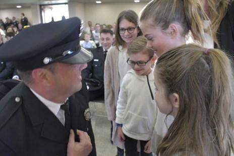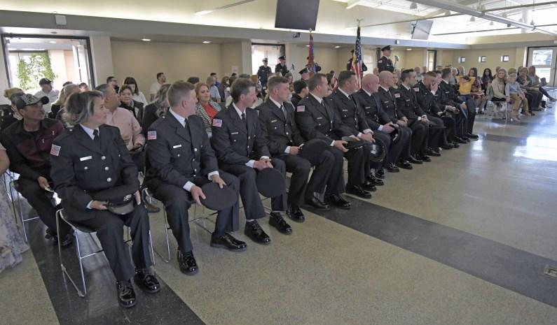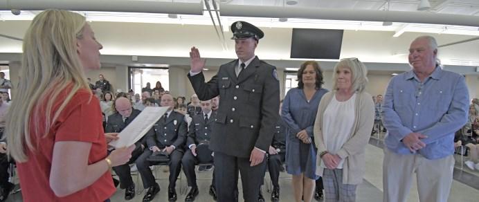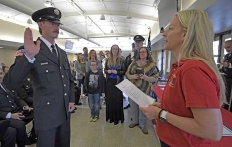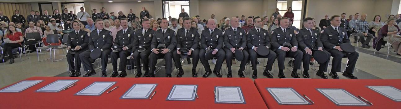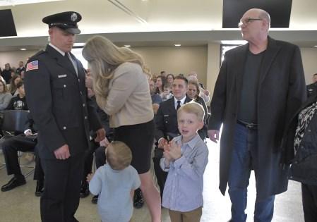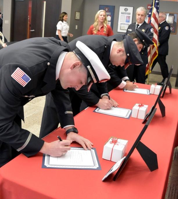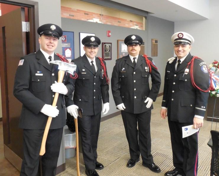 Congratulations to Firefighters Matt Hoover, Jeff Sheldon, Charlie Duer and John Cortilet who were promoted to the rank of Engineer, and Engineer Dan Fagan who was promoted to the rank of Lieutenant, at a promotional ceremony held Wednesday, August 30, 2023. Fire Commissioner Matt Rafferty administered their Oaths of Office and their loved ones pinned their new badges. Lieutenant Dan Fagan’s wife, Elyse, delivered his conferment speech. Congrats to all!