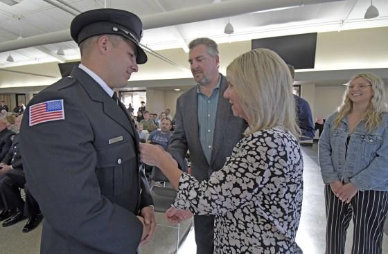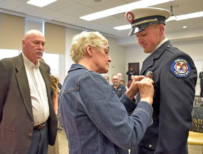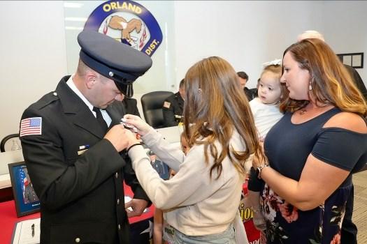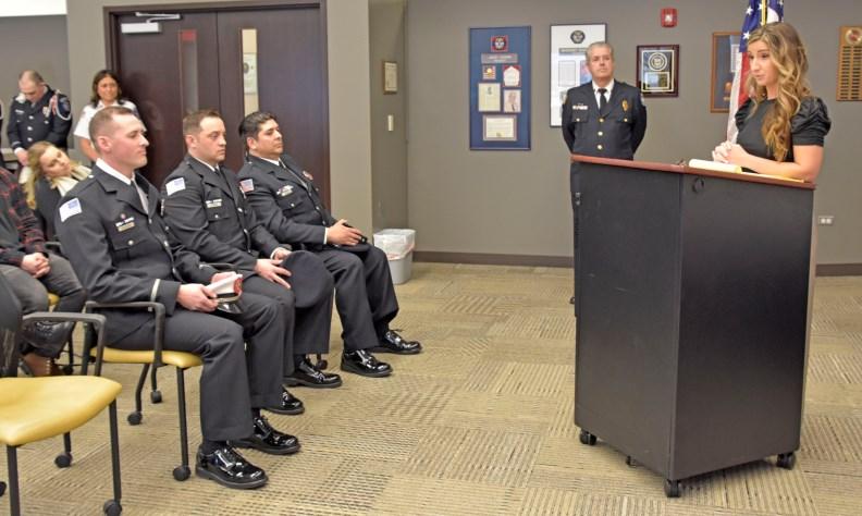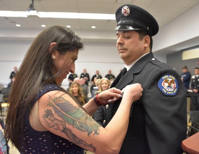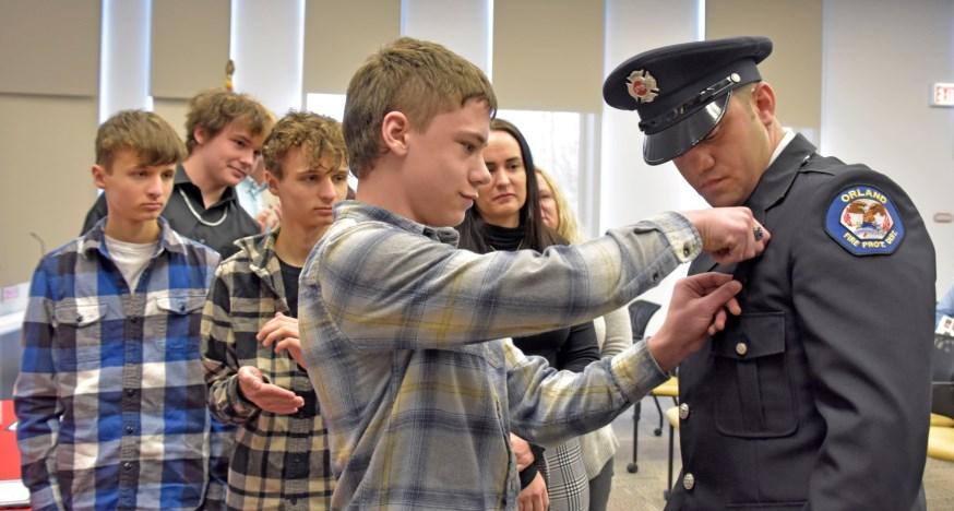 On Thursday, April 6, 2023, a promotional ceremony was held at Orland Fire District. Fire Commissioner Beth Damas Kaspar administered The Engineer Oath of Office to Firefighters Justin Dublin and Zach Zweizig. Justin's fiance, Araceli, pinned his Engineer badge and Zach's son, Tristin, pinned his Engineer badge. Next, Commissioner Kaspar administered the Lieutenant Oath of Office to Engineer Marc DeSardi. Marc's mom, Kathryn, pinned his Lieutenant badge, and his girlfriend, Francesca, delivered his conferment speech. Congrats gentlemen!