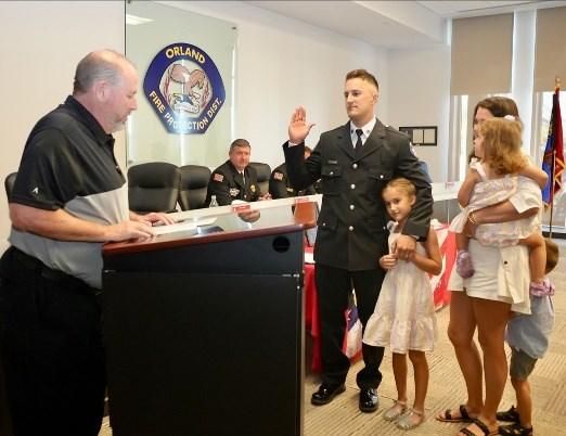 On Thursday, February 16, 2023, Engineer Garrett Flavin was promoted to Lieutenant with the OFPD. Fire Commissioner Brian O'Neill administered his Oath of Office, his Grandfather Garrett Flavin pinned his Lieutenant's badge, and his friend OFPD Firefighter Zach Zweizig delivered his conferment speech. Congrats Garrett!