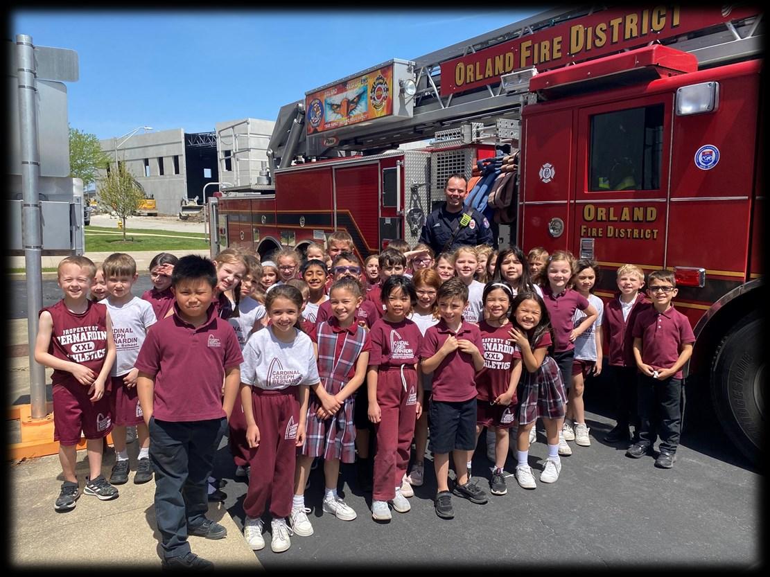 Cardinal Joseph Bernadine first graders concluded their Adopt a Firefighter program with Firefighter Mark Hogan. What a great way to wrap things up - with a fire engine Show & Tell Day. At the end of the presentation, they each received their own firefighter hats.