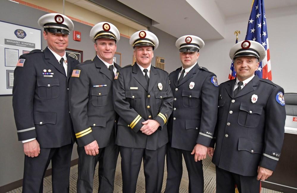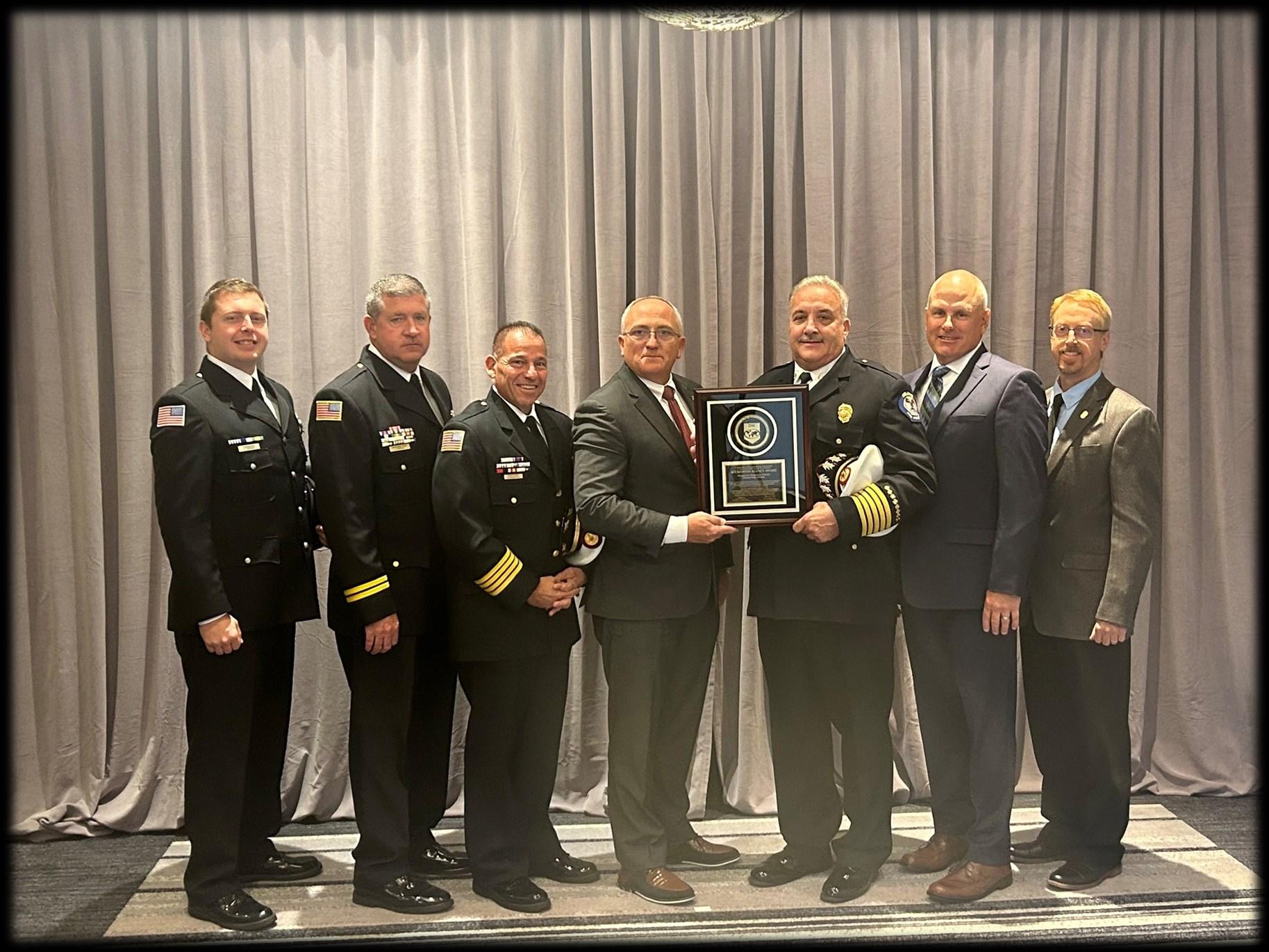 William Leddin, Deputy Chief Nicholas Cinquepalmi, Fire Chief Michael Schofield, Gold Shift B/C Nickolas Tufts, Administrative Chief John Purtill and Operations Chief Erick Johnson (Not pictured Red Shift B/C James Hynes).