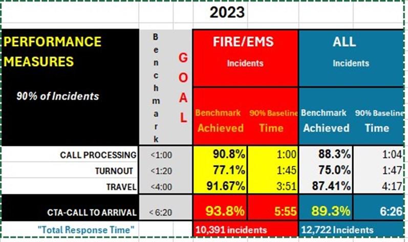 The performance of emergency responders is often measured by the time it takes personnel to arrive on the scene of the emergency call –“Call to Arrival”. Many steps take place prior to the arrival of a Firefighter/Rescue/Hazmat specialist or Paramedic at your side. The steps include call processing time in the Dispatch Center, notification to the appropriate fire station, crews gearing up and mounting apparatus, response of apparatus from fire station to scene, arrival of personnel and assembling of equipment, and then intervention.