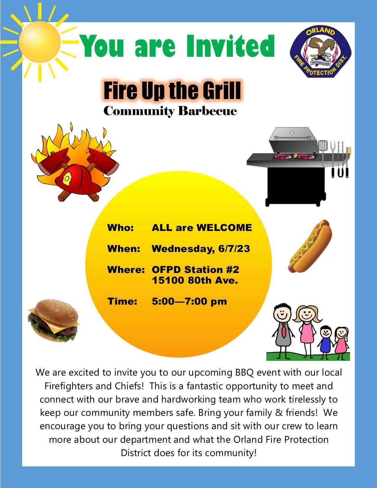 Thanks to all who came out for our first Barbecue with the Brave event on the evening of May 10th at Station 1. It was the perfect weather and our Public Education & Fire Prevention employees. Betsy, Mike and Ryan grilled delicious burgers and hot dogs for all to enjoy! Thanks to Senior Advisory Council members, Cadets, Firefighters, and Administrative employees who stayed to help and Trustee Kaspar who stopped by to visit!