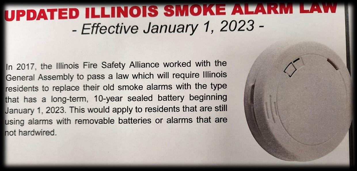 Per the Illinois smoke alarm law: Office of the State Fire Marshal, effective January 1, 2023, The updated law required Illinois residents to replace their old smoke alarms with the type that has a long-term, 10-year sealed battery. This would apply to residents who are still using alarms with removable batteries or alarms that are not hardwired.