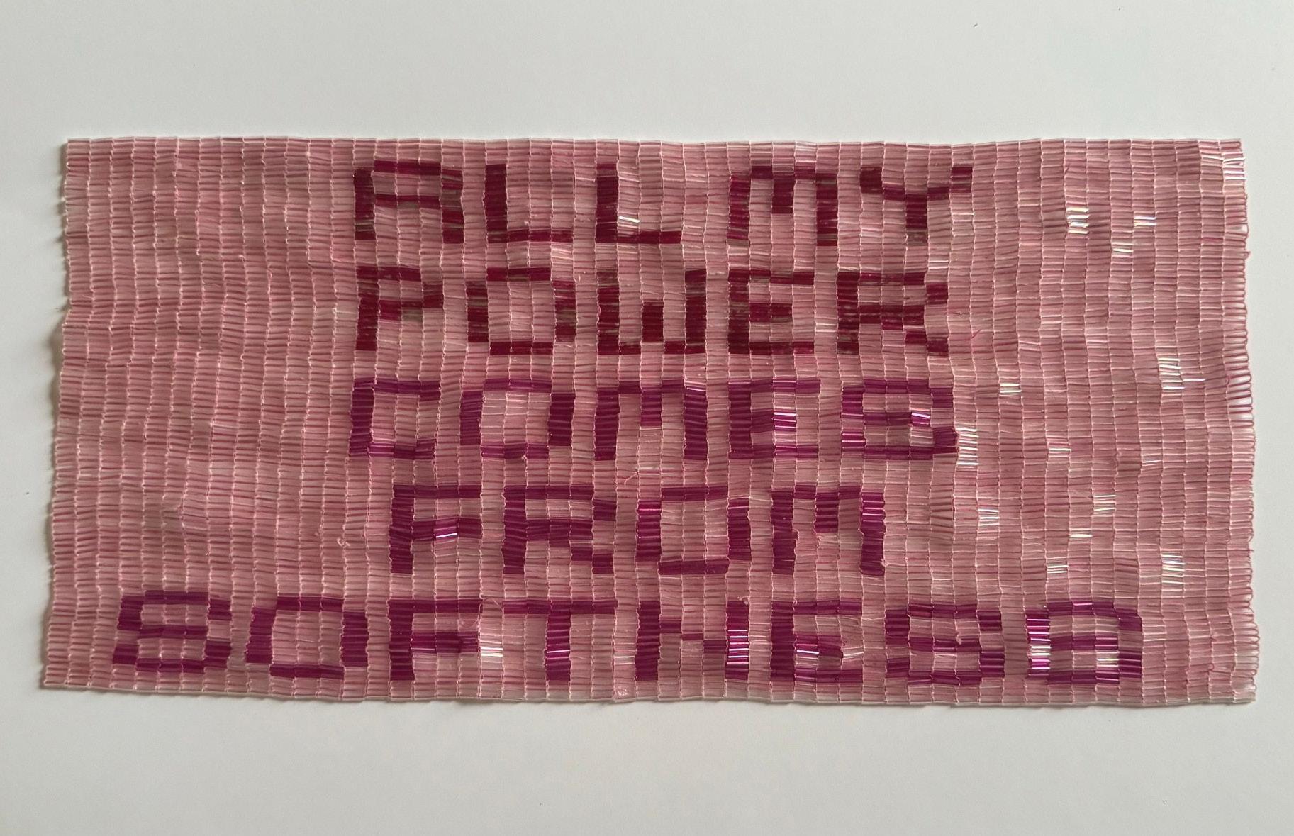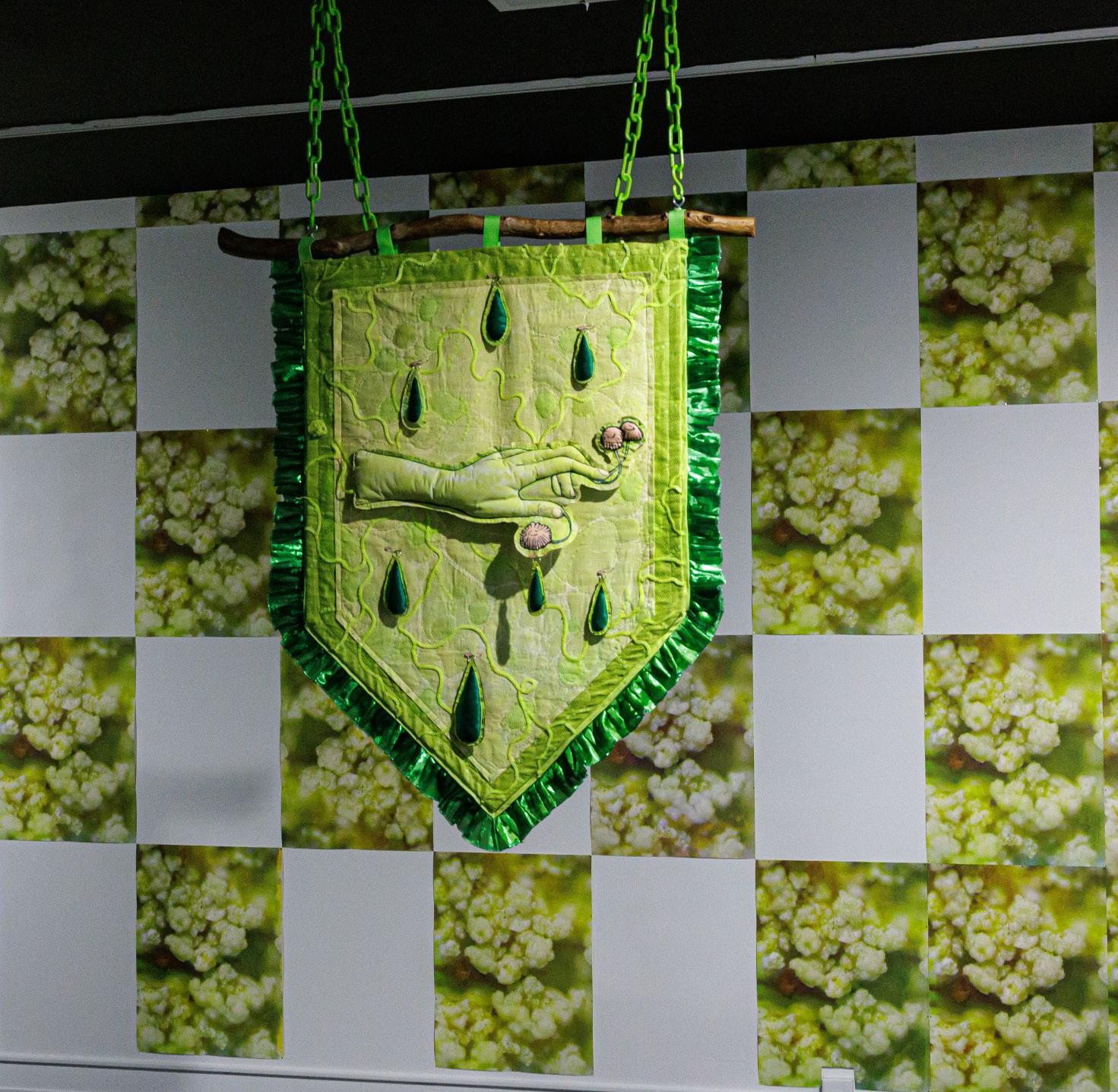 Banderín textil: tela serigrafiada, lentejuelas, malla, volantes, guata para acolchar, hilo, madera encontrada, encáustica y cadena de plástico.