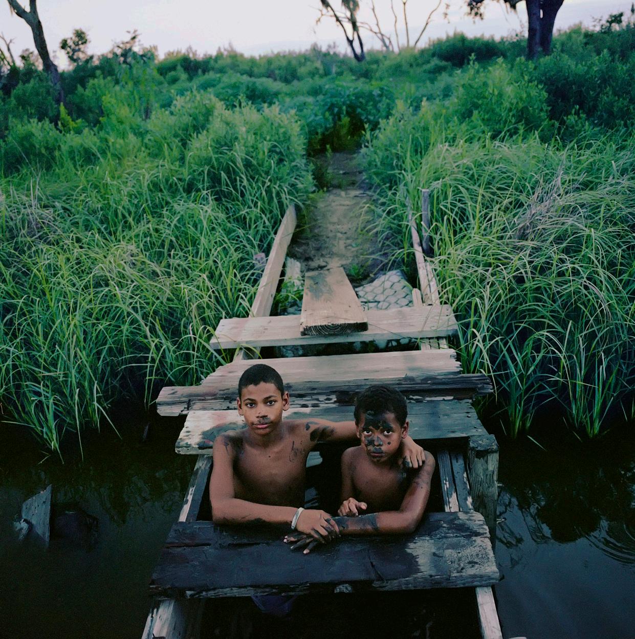 Joseph y Jasmon Jackson juegan en el pantano, Isle de Jean Charles, Luisiana 2010