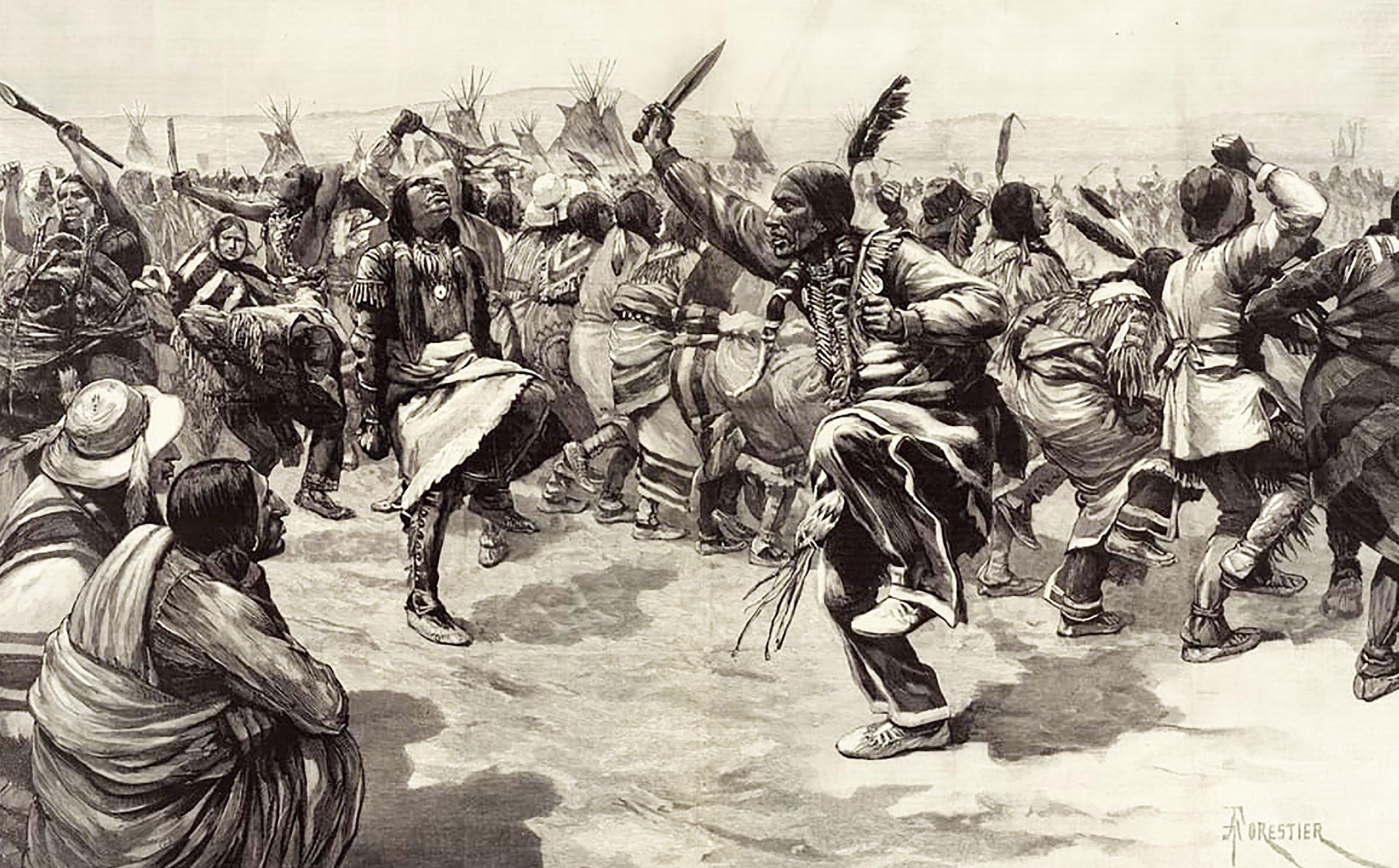 A contemporary illustration titled, “The Ghost Dance of the Sioux Indians in North America.”