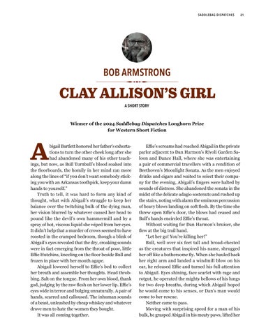We also celebrate the success of the 2nd Annual Longhorn Award. This year’s winning story, Bob Armstrong’s “Clay Allison’s Girl,” is featured in this issue. Special congratulations to last year’s winner, Michael Norman, whose story “A Death of Crows” went on to win gold in the Western Short Fiction category at the Will Rogers Me-