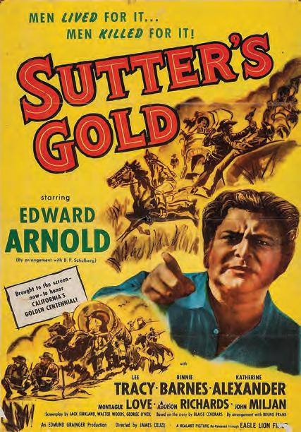 Sutter’s Gold was a 1936 western flm, directed by James Cruze for Universal Pictures. Carl Laemmie, the president of Universal Pictures, wanted a big outdoor western spectacle. He acquired the rights to the 1925 French novel “l’OR”, by Blaise Cendrars, and the stage play based on the novel written by Bruno Frank. Cruze had directed over a hundred silent movies in the twenties, his epic western The Covered Wagon, made in 1923, won the Kinema Junpo Award for Best Entertainment Film in Tokyo, Japan, in 1925. He had also directed several talkies in the thirties. He hired character actors to star in the picture, avoiding the more well-known actors, thinking they would detract from his epic. Edward Arnold was signed to play John Sutter. Binnie Barnes, Katherine Alexander, Lee Tracy, and Montague Love, with Harry Carey as Kit Carson made up the main cast. Laemmie gave Cruze carte blanche on the flm, and he spent lavishly. The flm cost two million dollars to make, at the time the average Universal flm was approx-
