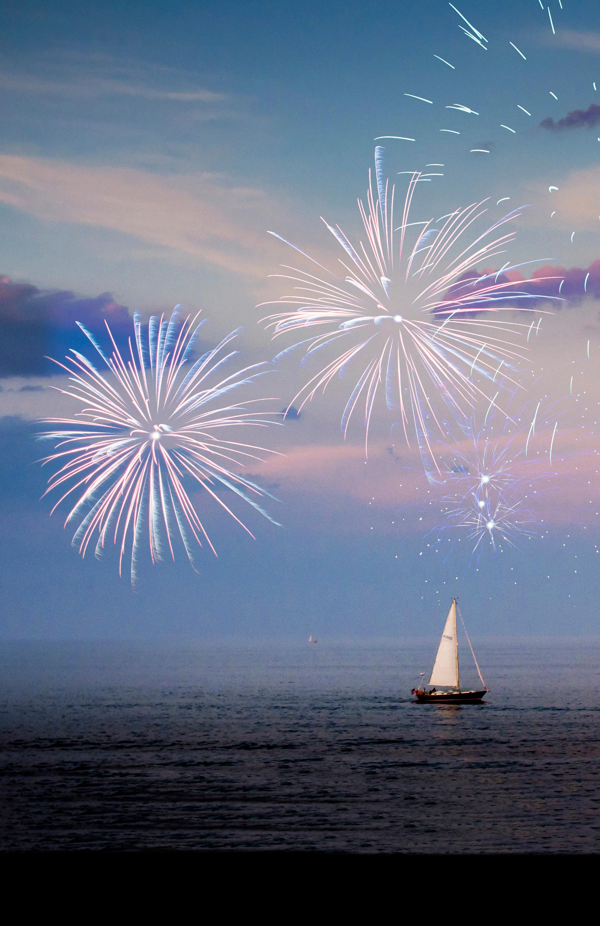 An impressive July 4th fireworks display is shot from the Main Beach Parking Lot. Music and dancing occur before the fireworks.