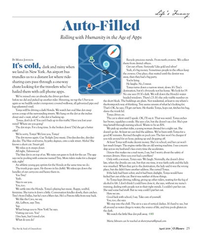 Recycle precious metals. From teeth crowns. We collect them from dental offices. Get out of here. Seriously? Like gold and silver? dark and rainy when Yeah, it’s big money. Sometimes people in the offices keep we land in New York. An airport bus TO NY the crowns. One place, they waited until the dentist was A away, then they had a big party. trundles us to a distant lot where rideYou’re lying. sharing cars pass through a one-way He laughs. No, I swear. chute looking for the travelers who’ve Tonya turns down a narrow street, slows. It’s Trey’s destination, but it’s obviously not his home. We look for 19. hailed them with cell phone apps. No one sees 19. It’s dark. We roll down the Honda’s waterWe’ve missed one car already; the driver got there beaded windows. There’s 23. It’s the only visible number on before we did and picked up another rider. Shivering, we tap the Uber icon the short block. The buildings are plain. Not residential, at least to my where’sagain as we huddle under a temporary covered walkway, all galvanized pipe and the-front-porch way of thinking. Trey seems unsure of what he’s looking for. logo-plastered vinyl. That’s OK, he says. I’ll get out here. He thanks Tonya, hops out, fetches his bag, Tonya will be driving a dark Honda. We watch her oval blue dot creep slams the trunk lid. across a map of the surrounding streets. We hang on the dot as she inches Tonya drives on. closer and — wait, what? — the dot is backing up. The car is silent until I speak. OK, I’ll say it. That was weird. Tonya arches Tonya, don’t do it! You can’t back up in this traffic! Have you lost your her brows, squelches a smile. She sees a lot, but she doesn’t say a lot. She’s putmind? Where are you going? ting herself through nursing school. Wants to be an RN. The dot stops. For a long time. Is she broken down? Did she get a better We pick up another rider, a young woman dressed for a night out. She offer? doesn’t go far. At least we can find the address. We’ve been with Tonya for a We’re sorry, Tonya! We love you, Tonya! good 40 minutes. Revised thought on pool cars: The fare won’t be cheaper if The dot moves again. Cue Twilight Zone music. Dee-dee-dee-dee, dee-deeyou ride around for an hour, picking up and dropping off. dee-dee. The blue oval turns, by jerky degrees, onto a side street. Ah-ha! She At least Tonya will make decent money. She’s in school, and her car won’t knows a short cut. Smart girl. last much longer. The engine rattles like an old sewing machine. I see concern We relax as it creeps closer. skip across my husband’s face every time she accelerates. All right, Tahnnnn-ya! I know this makes me a real mom, I say, but I worry about the safety of The blue dot is on top of us. We raise our gazes to look for the car. The app women drivers. Have you ever had a problem? says we’re pooling with someone named Trey. More riders make for a cheaper Only with a woman, Tonya says. We laugh. Normally, she doesn’t drive ride, right? late, when the drunks are out, but that one time, it was fairly early and the lady An athletic young guy sprints for the Honda at the same time we do. was smashed. When they got to the destination, the lady said it was the wrong The trunk pops open. He throws in his duffel. We telescope down the place, but she didn’t have another address. She cursed Tonya. handles of our carry-ons and heave them in. If the lady had been sober, and it had been daylight, Tonya would have You Trey? kicked her out of the car. But it was neither of those things. Yeah. So Tonya kept driving, talking, giving up other riders, waiting for the fog of Nice to see you. alcohol to lift. I don’t think I could have done it, she says, without my nurse’s You, too. training, dealing with people not in their right minds. I couldn’t put her out. We settle into the Honda. Tonya’s playing her music. Rappy, soulful, She said some bad stuff. But no way could I put her out. feminine. She turns it down a little. Conversation kindles slowly, then catches. Here we are. Trey’s from Dallas, but he’s not a Mavs fan. He’s a Pistons fella from way back. Good luck with school, I say. Take care of yourself. We like the Cavs, we say. You, too, she says. Ah, LeBron, says Trey. We step into the chill. The air is a sea of vertical dashes. It’s hard to see, but Yep. all around us water clings to water, the source of life, and tiny pools glisten in What brings you to New York? he says. the dark. Visiting our son. You? We watch the little blue dot pull away. OH I live here, but I travel a lot. What do you do? Maria Johnson can be reached at ohenrymaria@gmail.com By Maria Johnson