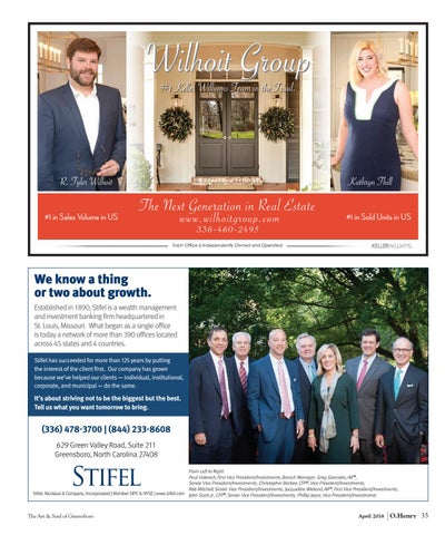(336) 478-3700 | (844) 233-8608 629 Green Valley Road, Suite 211 Greensboro, North Carolina 27408 From Left to Right: Paul Vidovich, First Vice President/Investments, Branch Manager; Greg Gonzales, AIF®, Senior Vice President/Investments; Christopher Barbee, CFP®, Vice President/Investments; Rob Mitchell, Senior Vice President/Investments; Jacqueline Wieland, AIF®, First Vice President/Investments; Stifel, Nicolaus & Company, Incorporated | Member SIPC & NYSE | www.stifel.com John Scott, Jr., CFP®, Senior Vice President/Investments; Phillip Joyce, Vice President/Investments