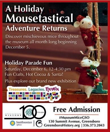 Mebane’s Nutcracker Stroll – Thru 12/31 Burlington’s Holiday Magic – 12/13 Christmas in the Park – 12/22 Saxapahaw Holiday Market – 12/6 & 12/7