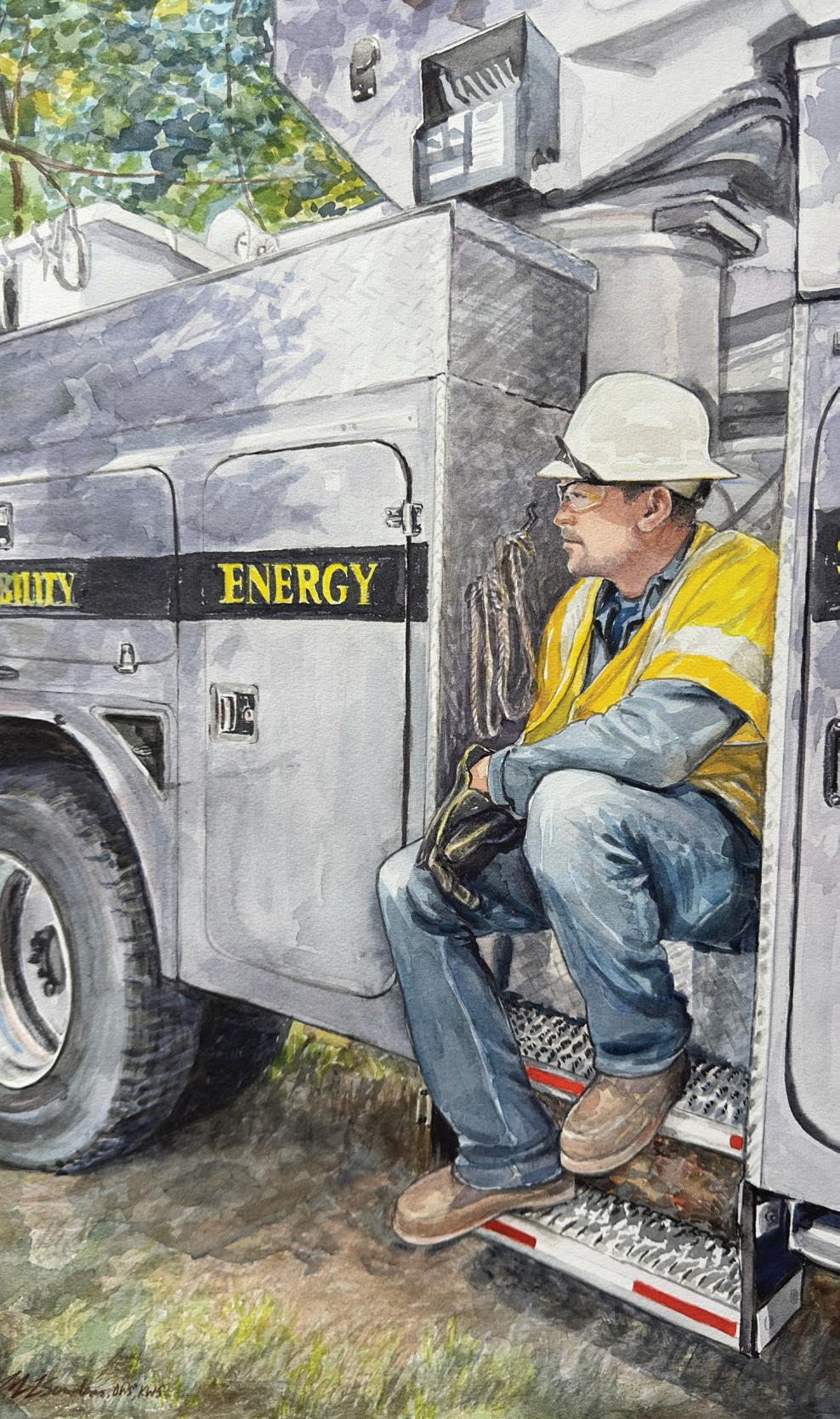 Electric Cooperative, where she’s a member, she asked for a volunteer model. Ryan Stallings, one of HWEC’s linemen at the time, stepped up, and she created three paintings of Stallings in action.