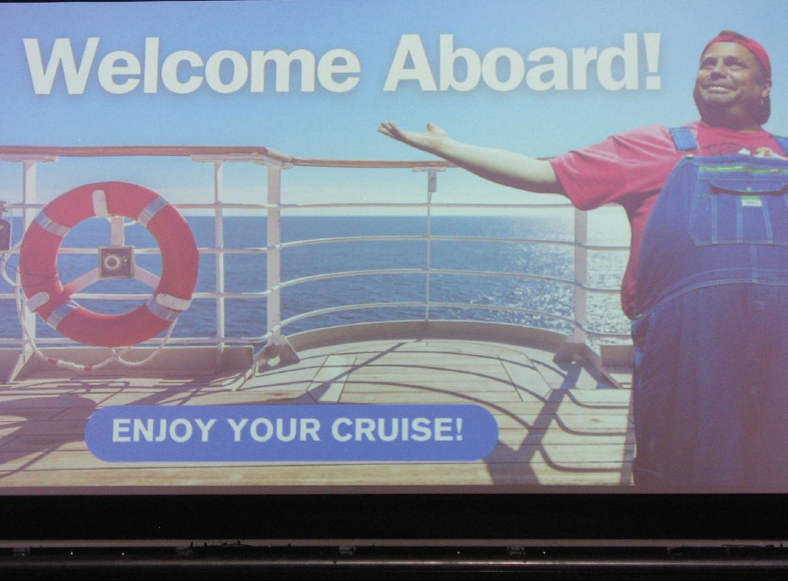 He lays out the rules during the welcome aboard session, reminding participants to wear the provided lanyards, which are essentially tickets to all the events. He encourages folks to make friends and to sample the swamp water, which is a combination of birch beer and orange soda. He also recommends signing up for game shows like “The Big Pyramid,” “The Happy Couple,” and “This and That.”