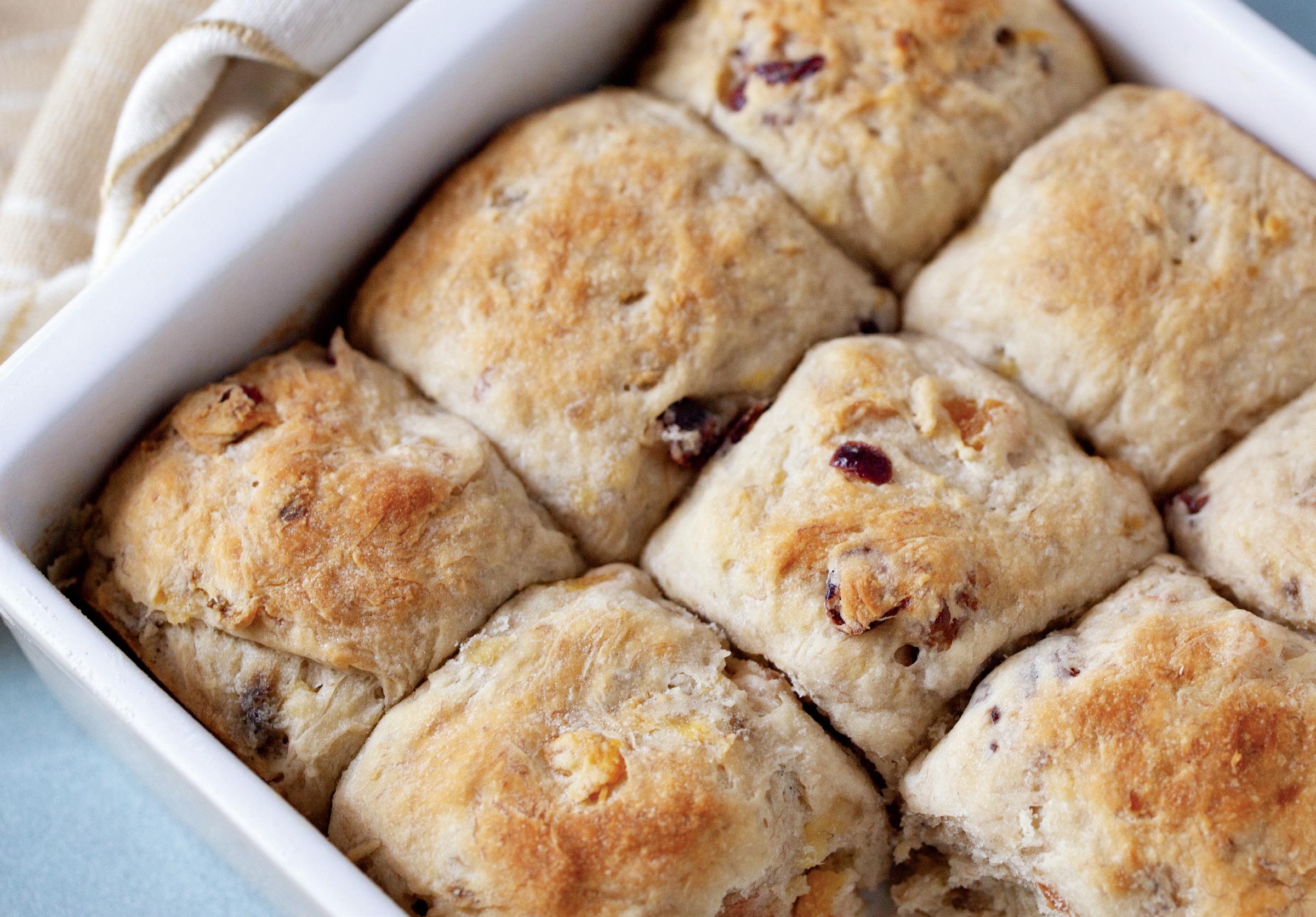 In a large bowl, mash bananas well, add egg, and mix together. Add yeast, salt, dried fruit, and melted butter, mixing well to combine. Add fl our in two batches, mixing with a spatula or paddle until all fl our has been incorporated and the dough is sticky. Scrape sides of bowl, placing the dough in a round shape in the center. Cover and let rise for 1½ hours, or until doubled in size. Drop onto a lightly fl oured surface and work into a cylinder shape. Cut into 9 equal pieces. Tuck the bottom of each piece into the middle and roll into a tight ball. Place rolls into 10 x 10-inch baking dish greased with butter so the rolls are touching. Cover and proof for another 1½ hours, or until doubled in size. Uncover and brush with melted butter. Preheat oven to 350 F and bake for 20 to 25 minutes. Let cool to the touch, then tear apart and serve. Store in an airtight container for up to 3 days. Eat for breakfast, a snack, or a sweet dinner roll.