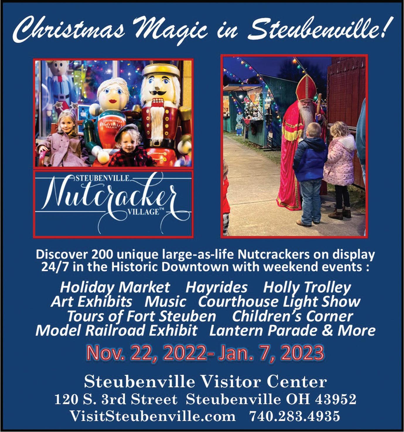 NOV. 22–JAN. 7 – Steubenville Nutcracker Village and Christmas at the Fort, Steubenville Visitor Center, 120 S. 3rd St., Steubenville. Free. Over 180 life-size, handcrafted