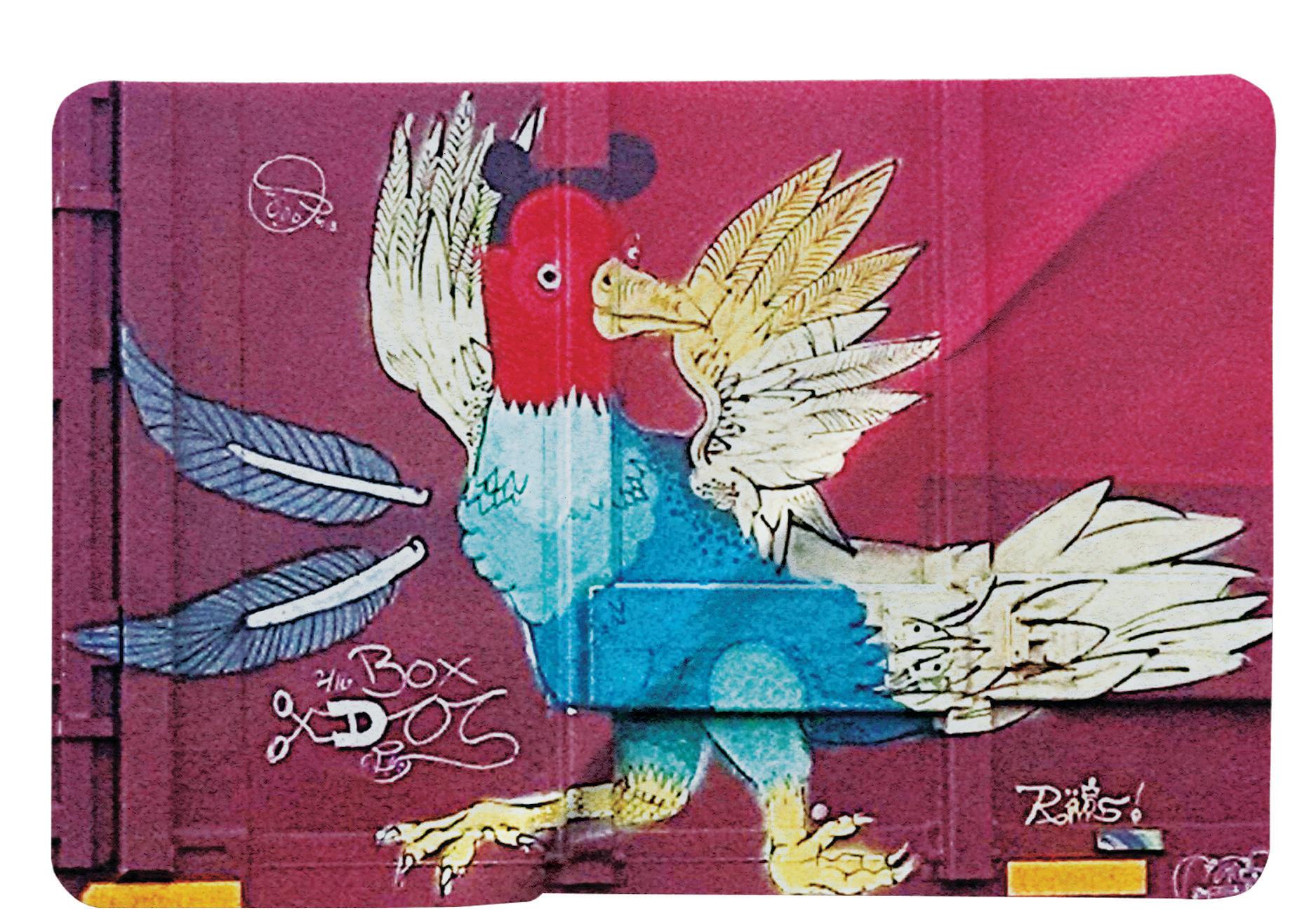Trains often are covered with works from slapdash to sublime. Favorite subjects include political cartoons, celebrity satire, inspirational quotes, fantasy, and whimsy in all its many forms.