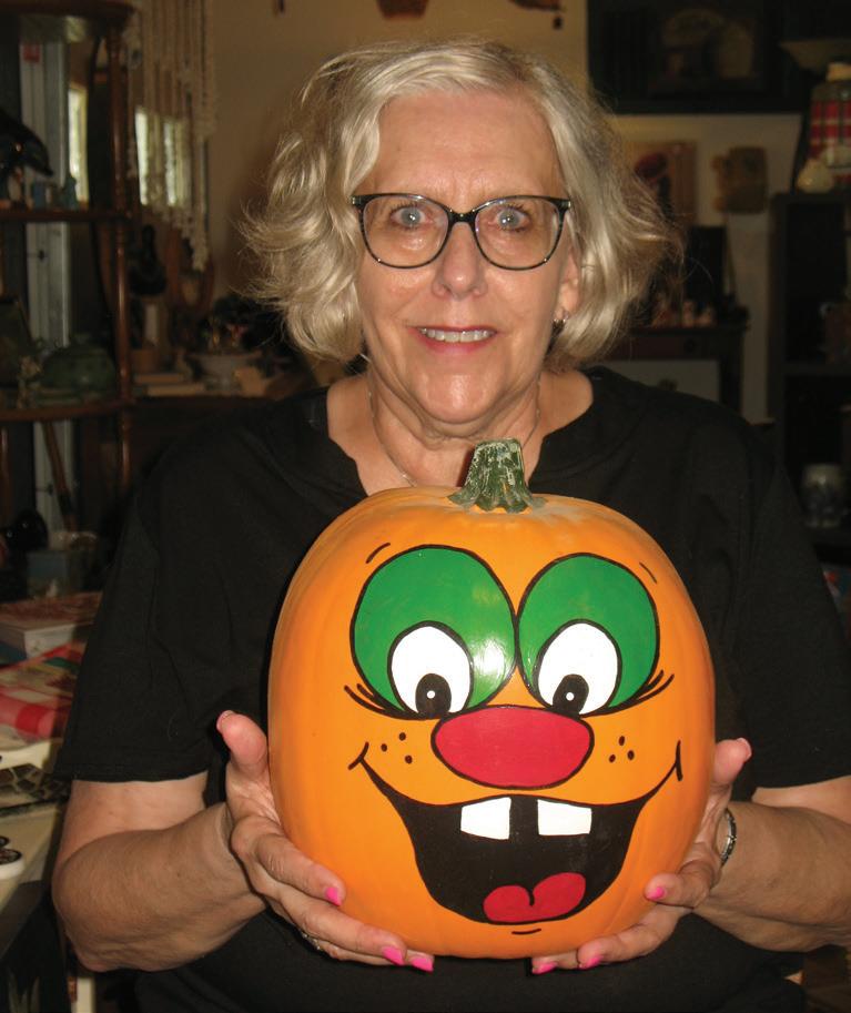 “I’m not artistic but I like drawing silly faces,” she says. “We work assembly-line fashion in the garage with family members brushing on designated acrylic paint colors. It’s not unusual to have 20 pumpkins in various stages at any given time.”