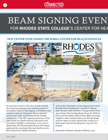 As summer turned to fall, two events marked the ongoing progress of an exciting project in downtown Lima. In late August, a milestone was etched in steel as Chancellor Randy Gardner joined other state and Rhodes State College leaders for a “Top Off” signing ceremony at the new Center for Health Science Education and Innovation (CHSEI) in downtown Lima. And in September, the Rhodes State Board of Trustees approved the naming of the new facility as the Borra Center for Health Sciences. FALL 2020