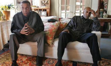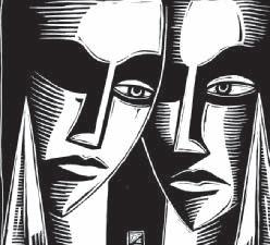Left: Subjects of the chapter “Wrongfully Convicted: Tim and Gary” in Death and Forgiveness, childhood friends Tim Howard (left) and Gary James spent nearly 25 years in prison after falsely being accused of robbing an Ohio National Bank in Columbus and murdering its security guard, Berne Davis. Middle: The Columbus Dispatch, Feb. 20, 1999. Right: The illustration An Eye for an Eye by Evangelia Philippidis.