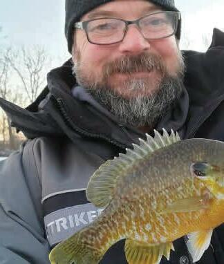 Ice fisherman Bill Baum poses with his freshly caught green sunfish.