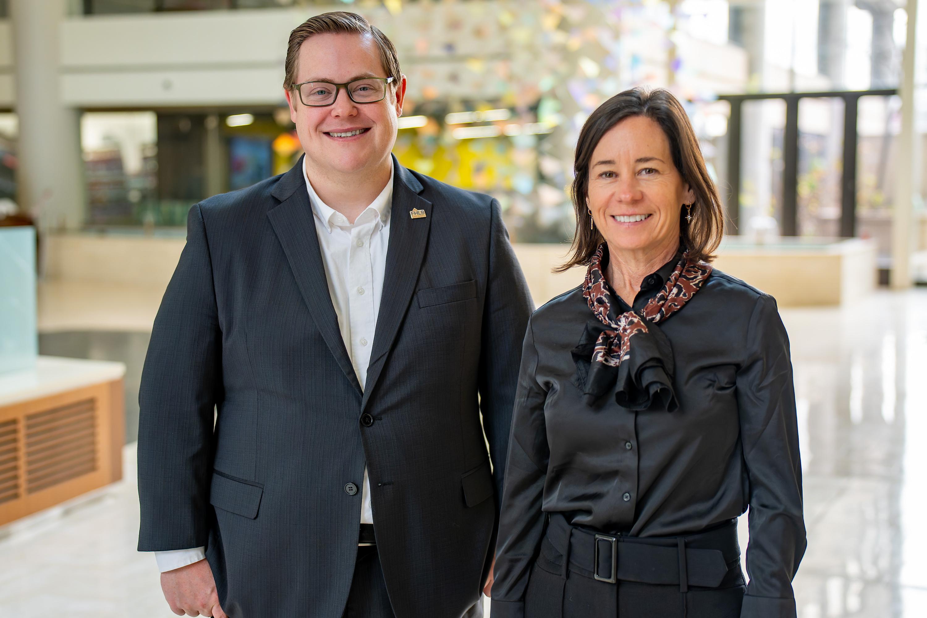 OBL President and CEO, Mike Adelman, and OBL Chair, Jenny Saunders, pose for a photo with Acting Comptroller Rodney Hood.