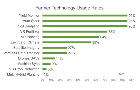 Almost all Ohio soybean farmers surveyed are utilizing yield monitors, auto steer, and soil sampling. A lesser percentage are using newer and less proven technologies like variable rate crop protection and drones.
