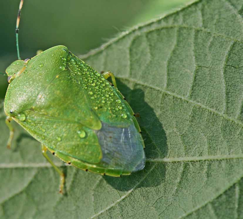 Stink bugs have a low economic threshold and can cause significant damage to soybean plants. Their populations tend to flourish during hot, dry summers. Pictured is an adult green stink bug.