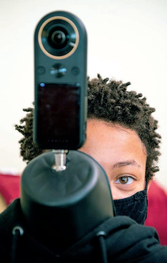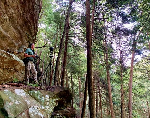 Laura Bilson, BSVC ’23 [TOP RIGHT] Matt Love, MFA ’18, immersive media production manager at the Game Research and Immersive Design (GRID) Lab, captures the sights and sounds at a local nature preserve that is part of the OHIO Museum Complex. The GRID Lab and researchers in the Heritage College of Osteopathic Medicine partnered with OhioHealth on a tranquil virtual reality simulation